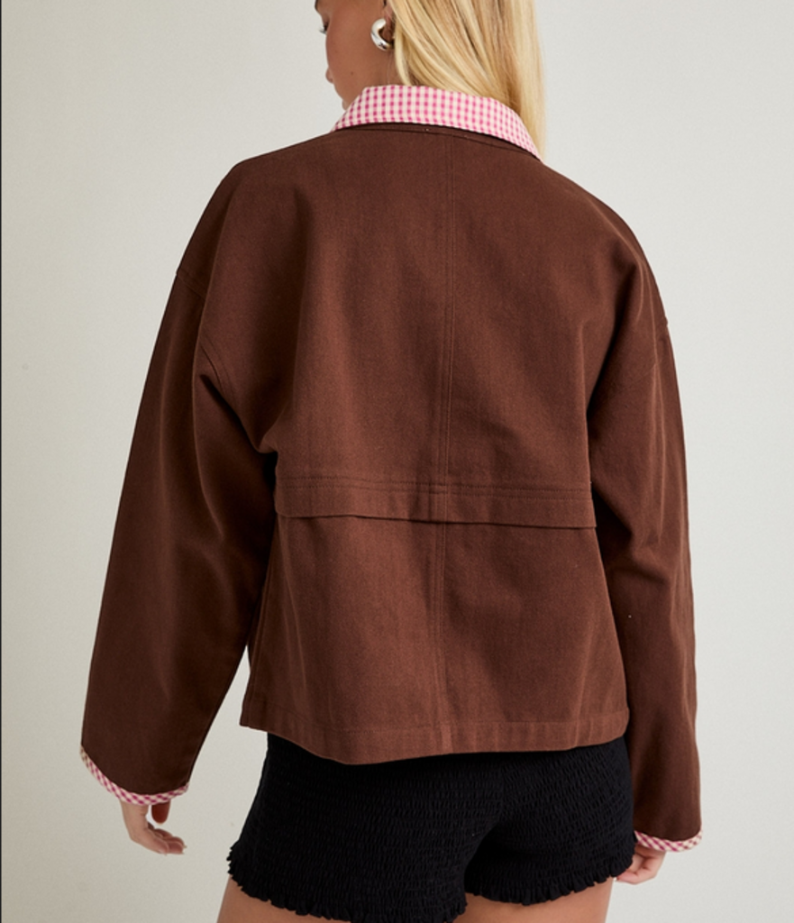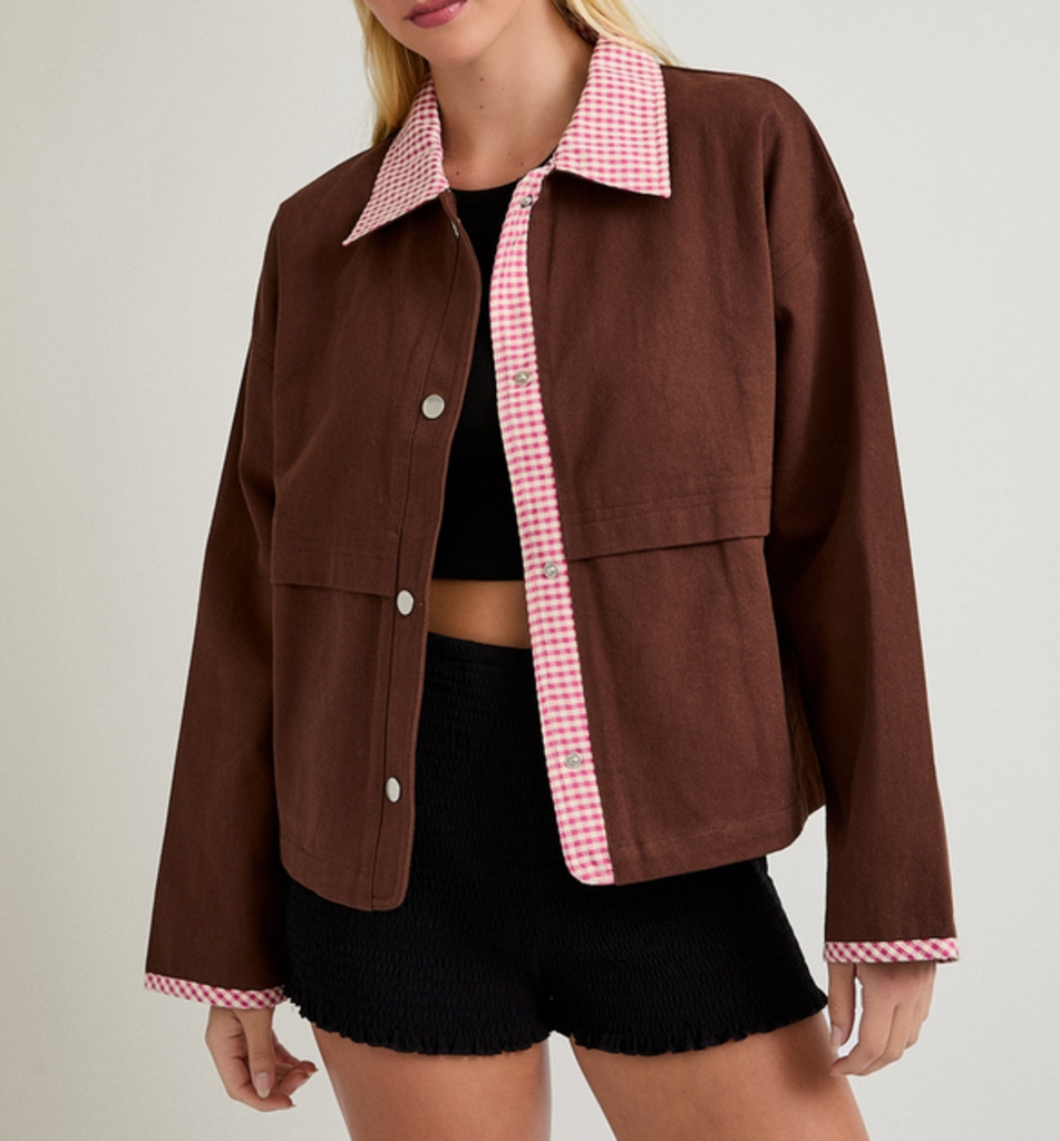 MEDIUM Brown Shacket with Gingham Collar